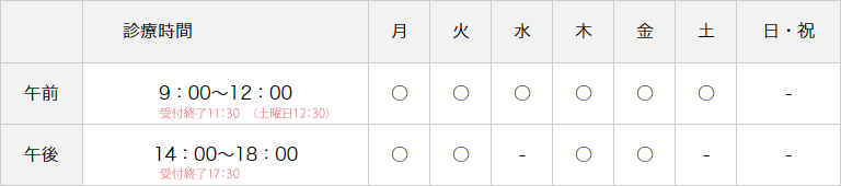 - 午前の診療受付は11:30までとなります。(土曜日は12:30まで)